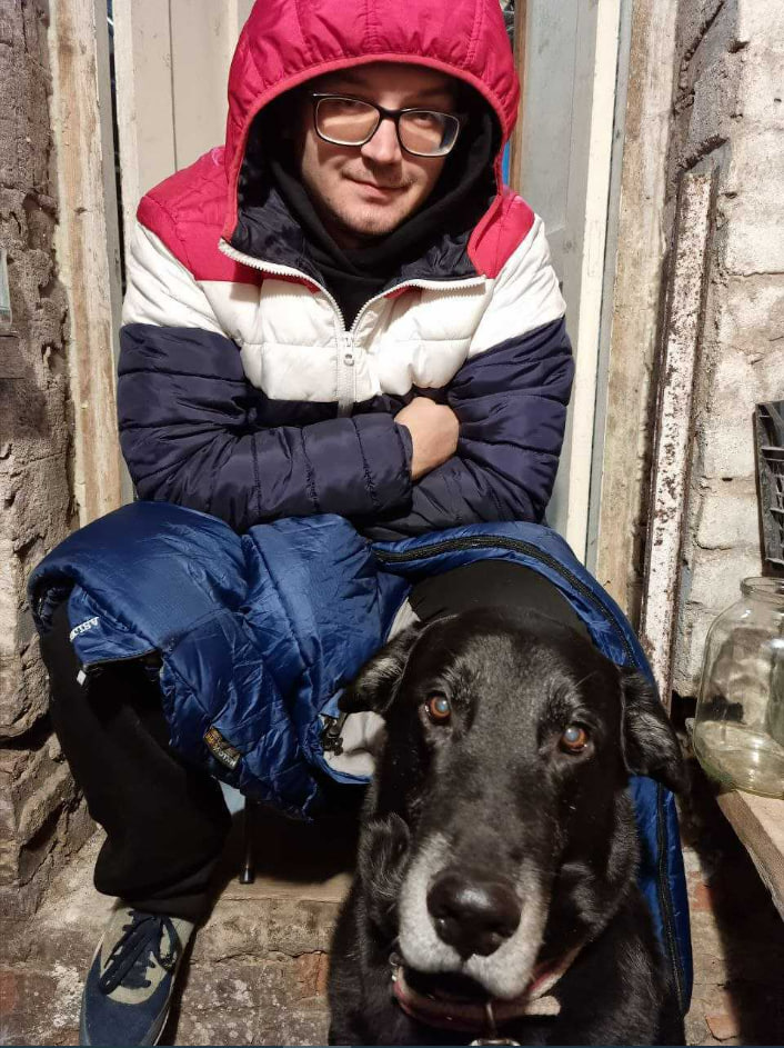 Oleksii Shulakov and his dog, hiding in the bomb shelter during the shelling in Kyiv.